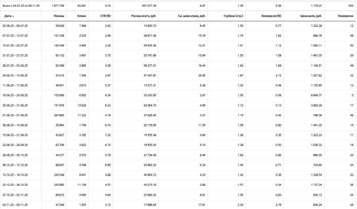 Мы запустили большую летнюю акцию и резко увеличили бюджет в 3–4 раза. Результат предсказуемый: стоимость заявки взлетела с привычных 1233 ₽ до 6000+ ₽. Кампании «захлебнулись», лиды стали золотыми.